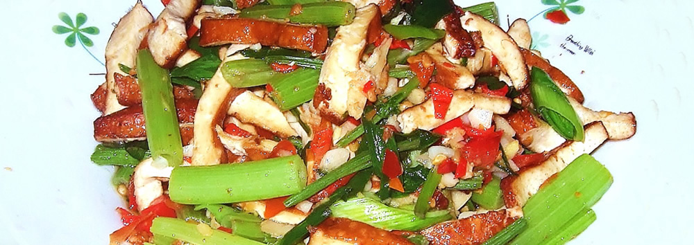 先將油燒熱放蒜片爆香,再放入豆干(切條狀)翻炒2-3分鐘,加入芹菜、剁椒醬2匙、鹽、味素、醬油(少許)、蔥段快炒2-3分鐘即可上桌。(美味的家常料理)
