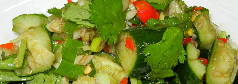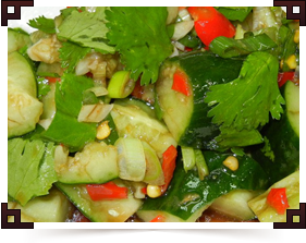將小黃瓜切成小塊,再放入鹽(少許)、醬油(少許)、烏醋、味素、香油、花椒油、蒜泥、蔥花、香菜、剁椒醬1-2匙,均勻攪拌即可。 (清爽開胃的涼拌菜)